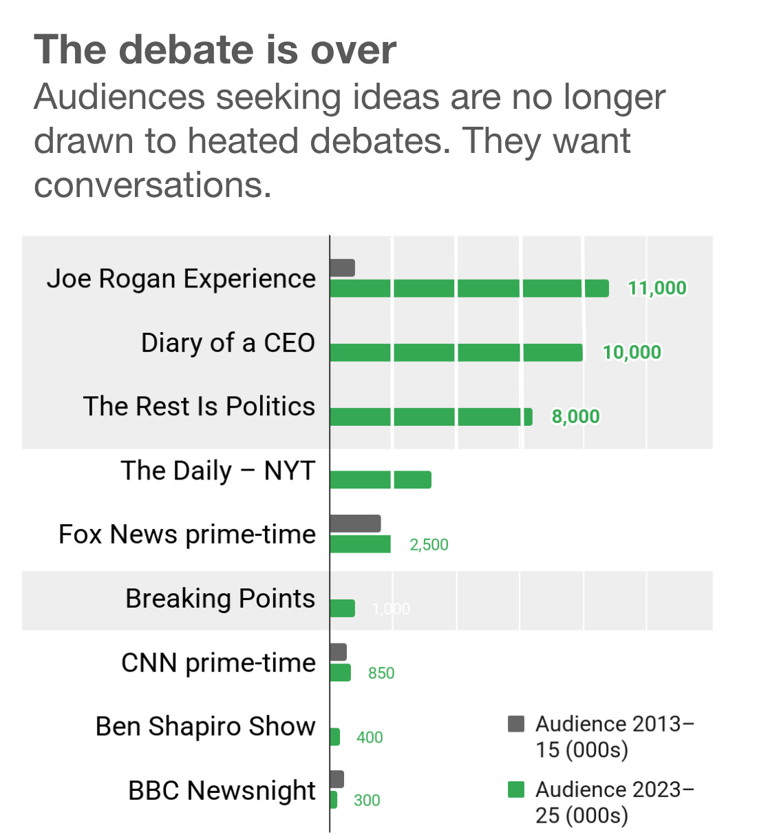 Why are our smartest minds unable to talk and converse like regular people? Why are panels so dull when podcasts are so interesting? Two words: media training. The comms industry is stuck preparing people for the media TV-interview sprints of the 2000s, when the primary medium for building trust and influence in 2025 is a conversation that can last for years.